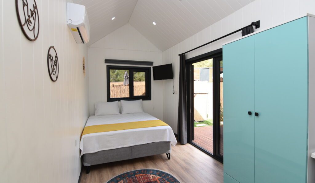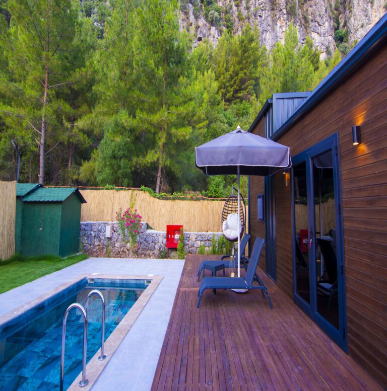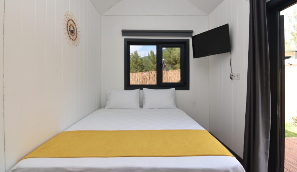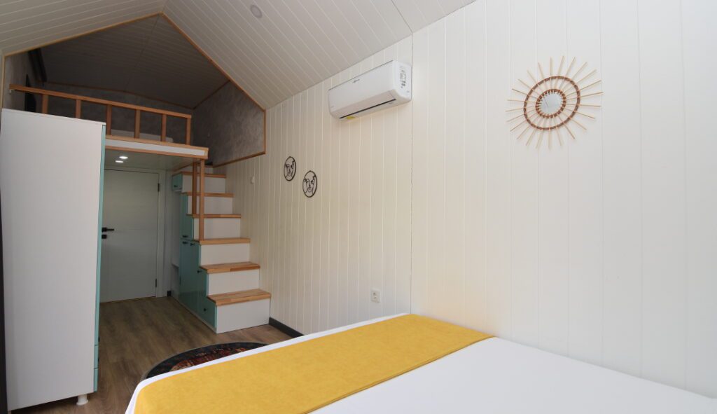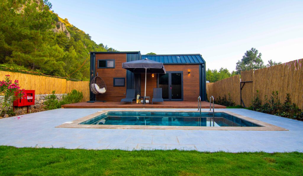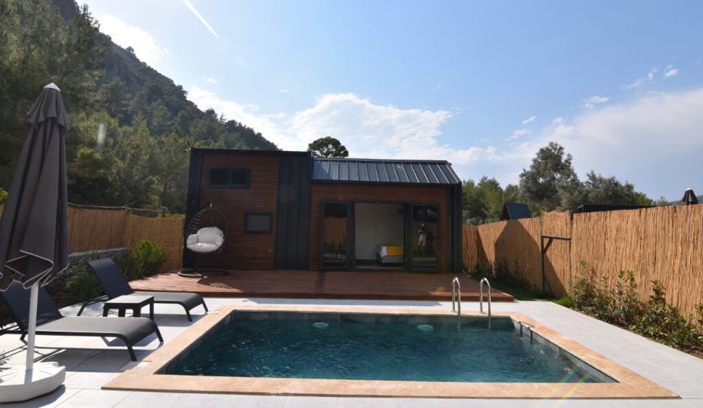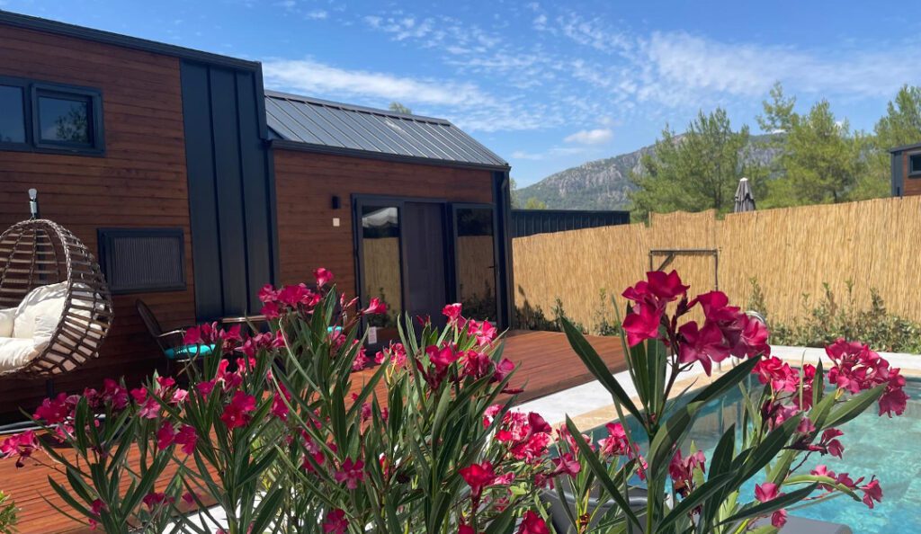 Our 26 m² Tiny House features a private pool (4×5 m). It contains two double beds. Our room, which consists of a bedroom, loft floor, shower and sink, is at the service of those who want a unique holiday experience.