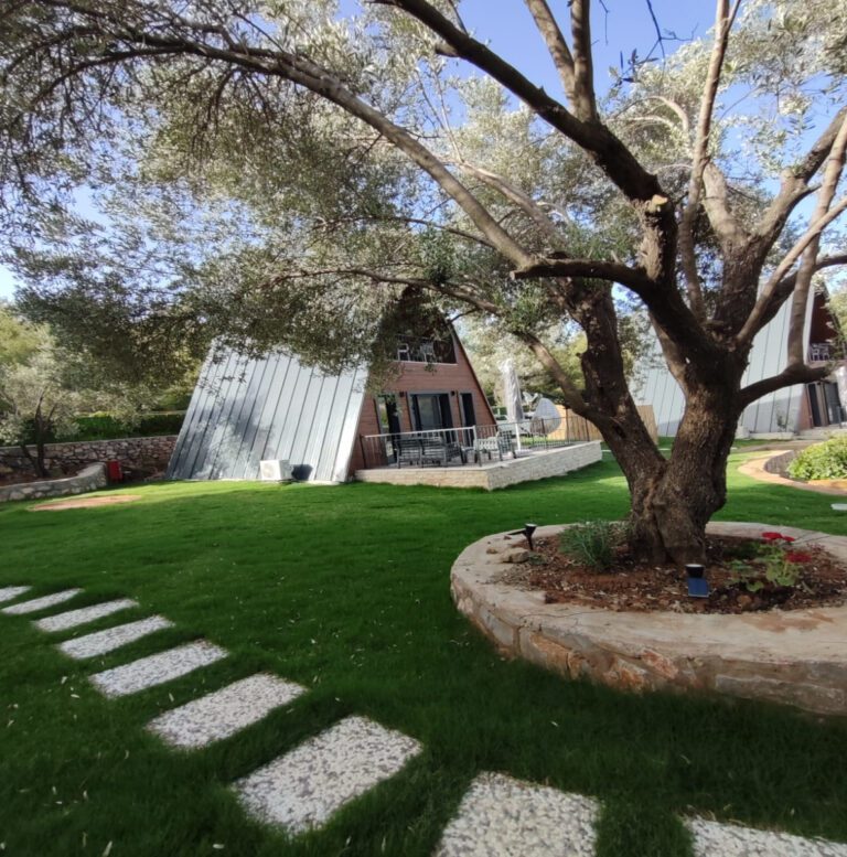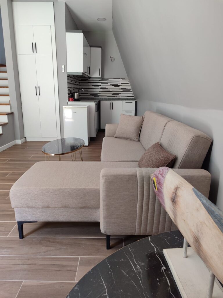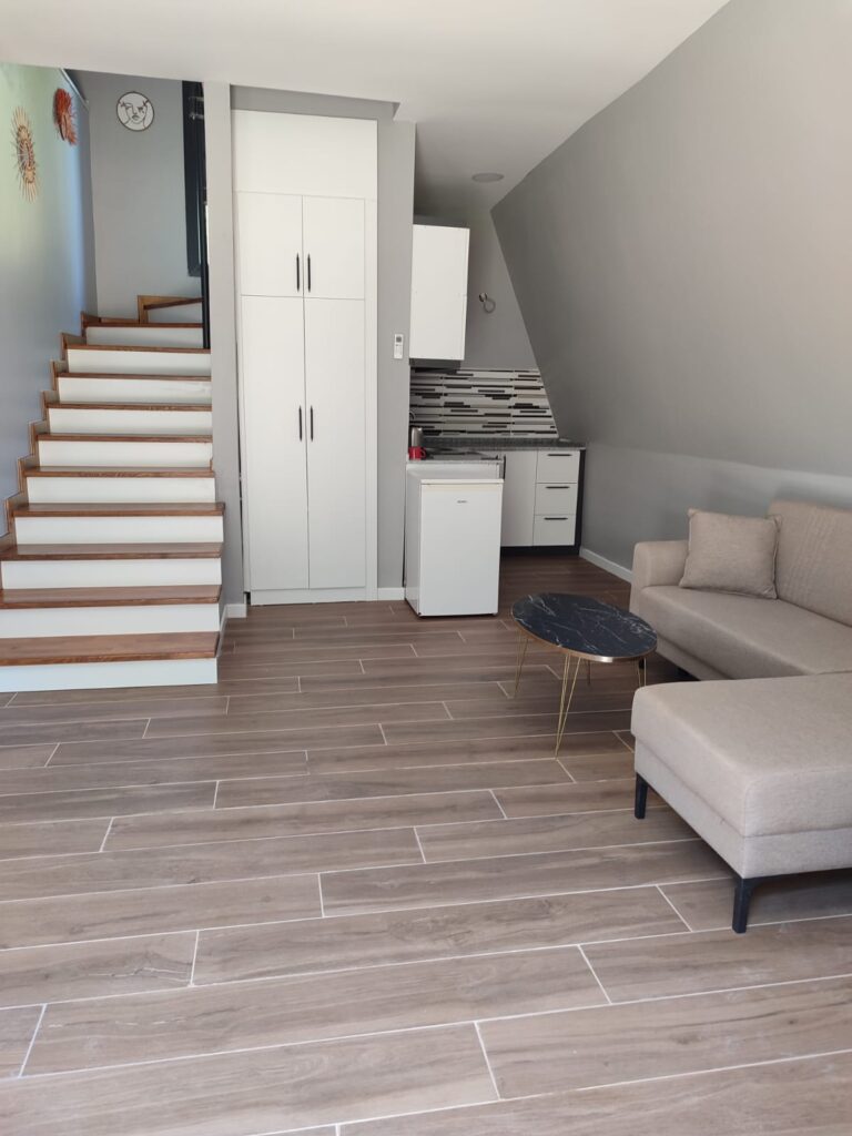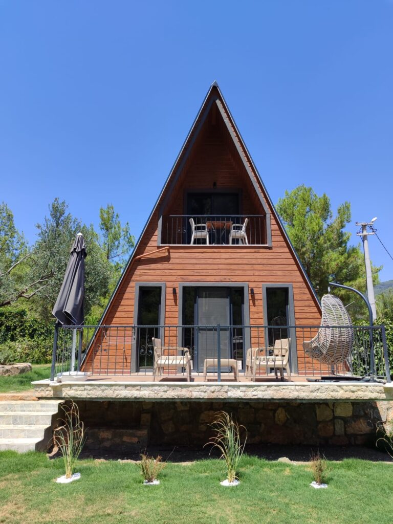 On the ground floor of our 60 m² bungalow, there is a living room and a bathroom. The living room features a loft-style sofa that can be used as a single bed. Upstairs, there is a double bed and a private viewing terrace. There is a shared swimming pool measuring 16×8 meters.