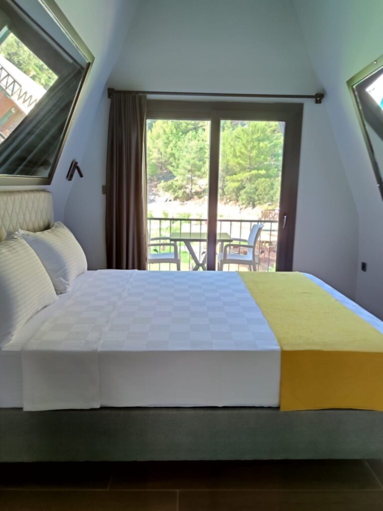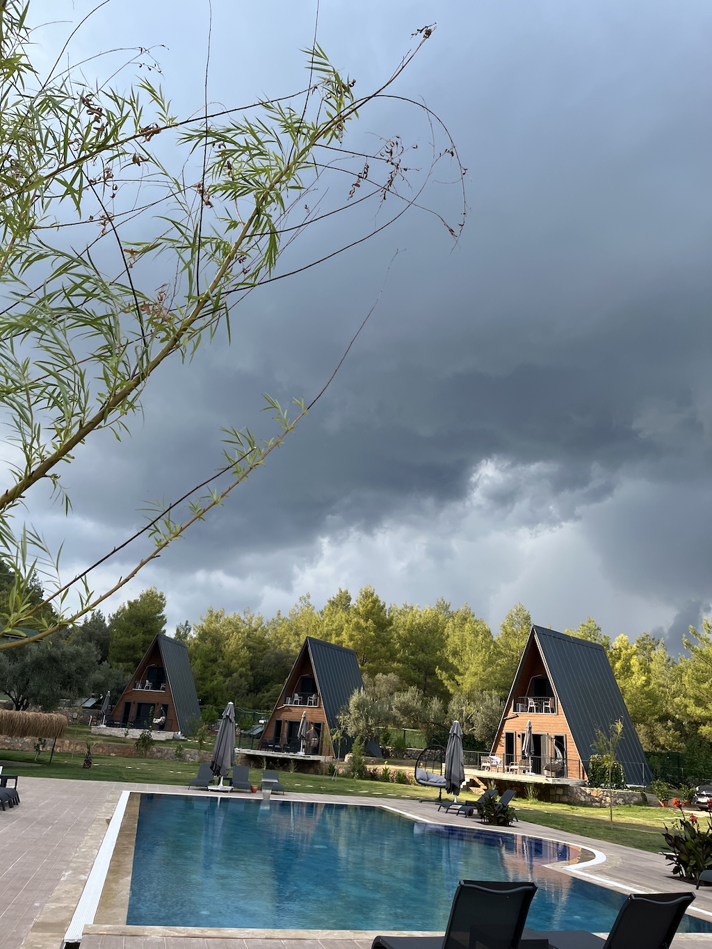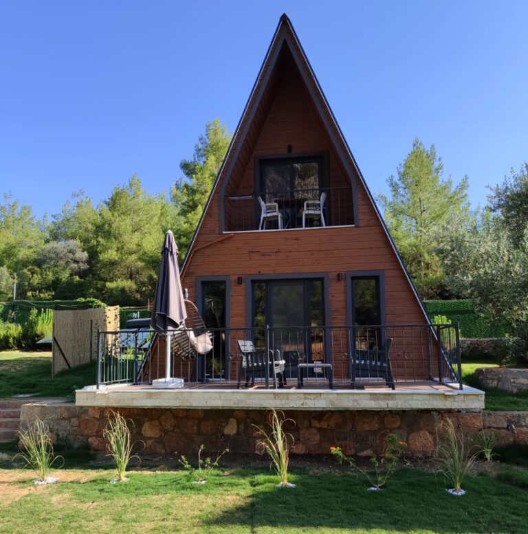 On the ground floor of our 60 m² bungalow, there is a living room and a bathroom. The living room features a loft-style sofa that can be used as a single bed. Upstairs, there is a double bed and a private viewing terrace. There is a shared swimming pool measuring 16×8 meters.