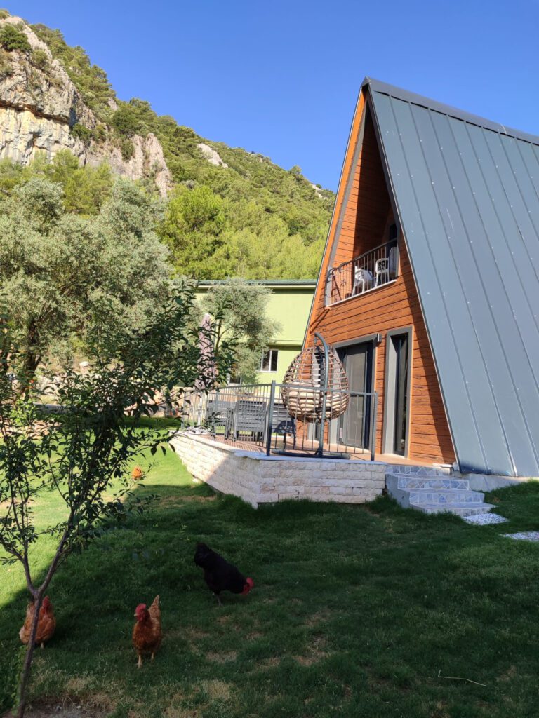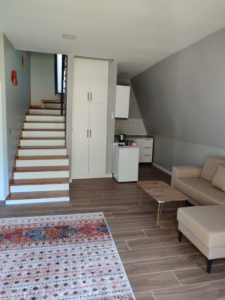On the ground floor of our 60 m² bungalow, there is a living room and a bathroom. The living room features a loft-style sofa that can be used as a single bed. Upstairs, there is a double bed and a private viewing terrace. There is a shared swimming pool measuring 16×8 meters.
