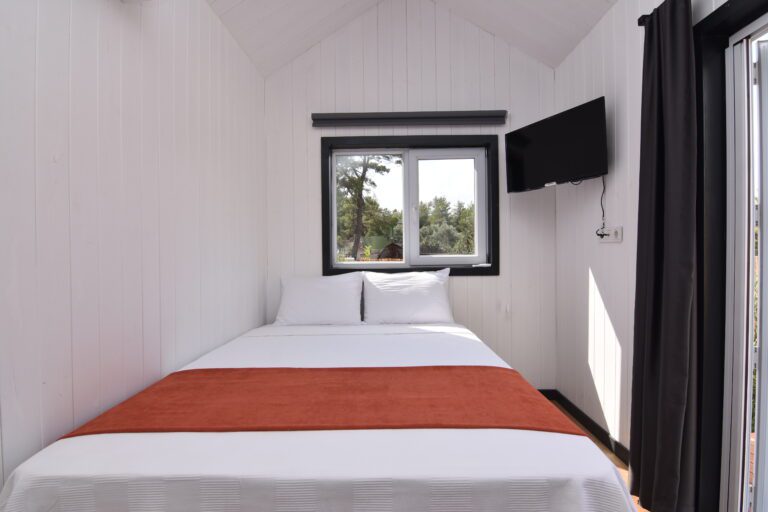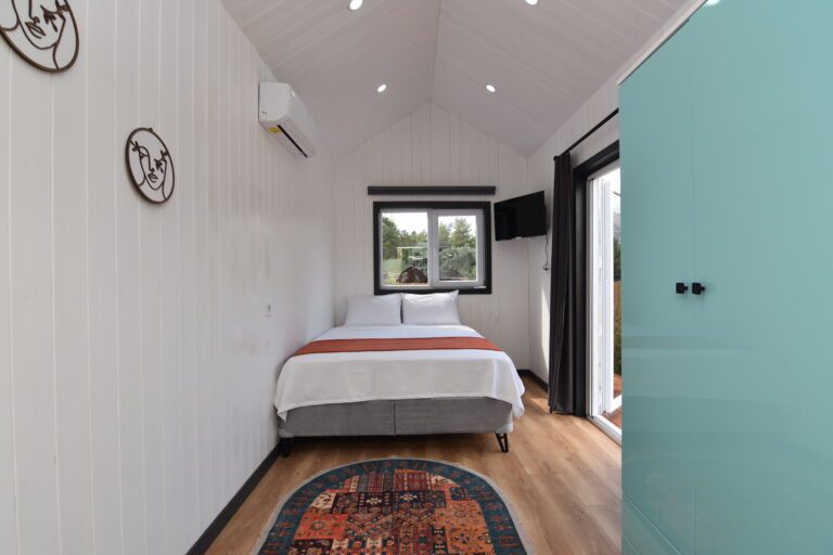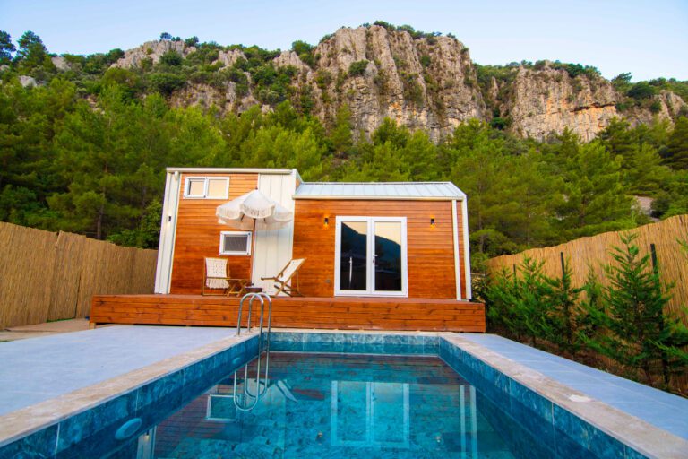 Our 26 m² Tiny House features a private pool (4×5 m). It contains two double beds. Our room, which consists of a bedroom, loft floor, shower and sink, is at the service of those who want a unique holiday experience.