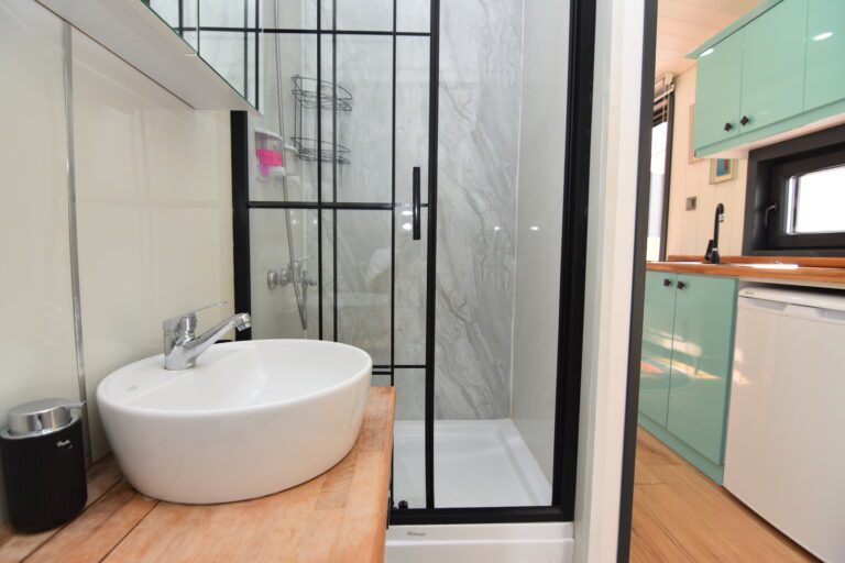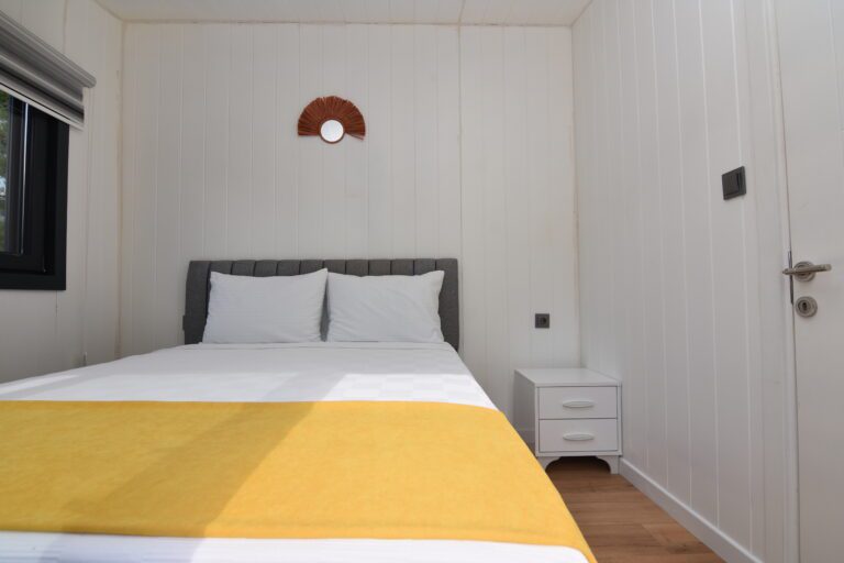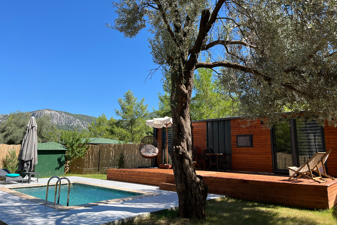 Our 27 m² Tiny House features a private pool (4x5m). It contains 1 double bed and a loft sofa that can be converted into a bed. Our house, which consists of a bedroom, shower and sink, is at the service of those who want a unique holiday experience.